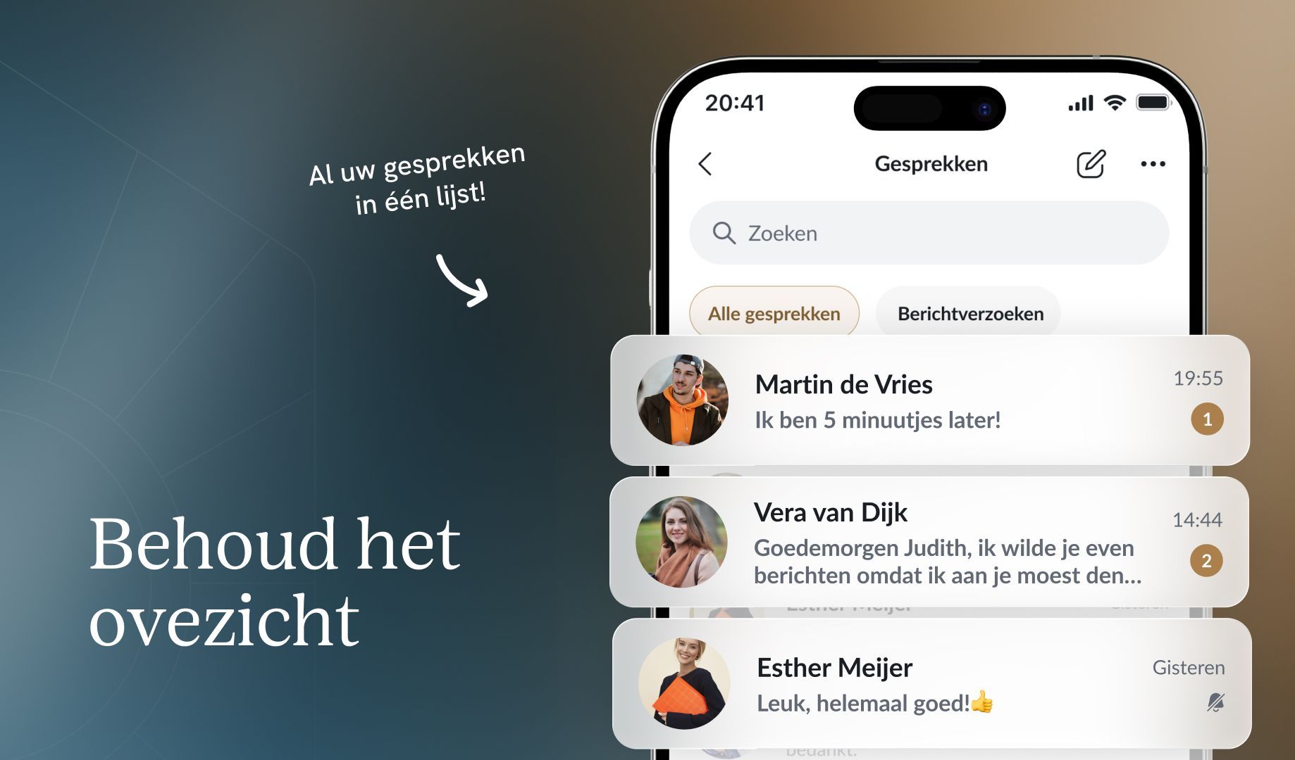 De app is duidelijk en makkelijk in gebruik, we noemen dat intuïtief. Dat geldt ook voor chat. Wat je verwacht, is wat er gebeurt. Via het bericht-icoon op de homepage ga je direct naar de gesprekken. Je kunt ook via de gemeentelijst iemand opzoeken, klikken op het profiel en daar een gesprek starten. Doordat gesprekken allemaal in één lijst staan, behoud je ook het overzicht.